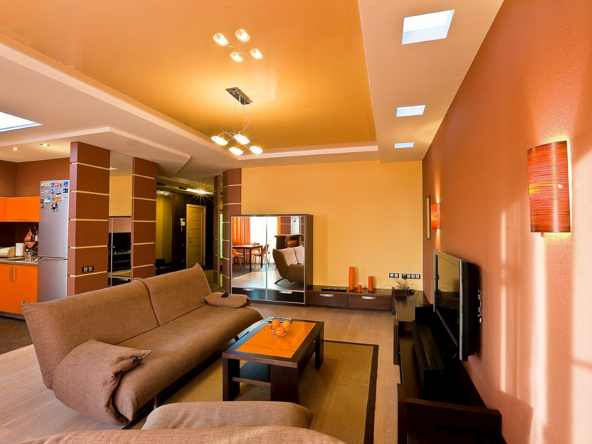 В помещении с акцентами в виде яркой мебели или текстиля, гармонично будет смотреться светлое однотонное полотно. В детской можно проявить фантазию и оформить комнату по вкусу ребенка, а для классической гостиной подойдет матовая поверхность с деликатной подсветкой.